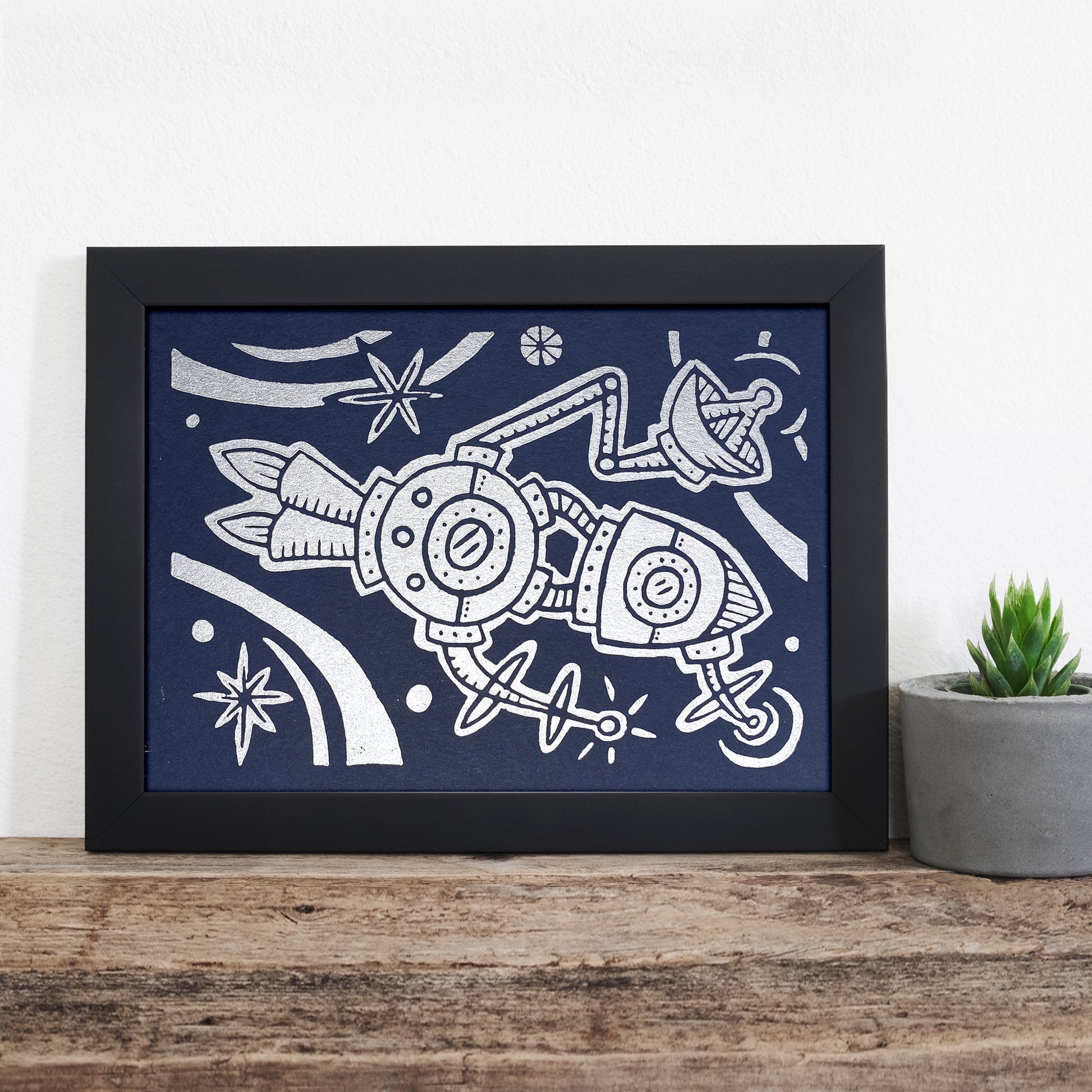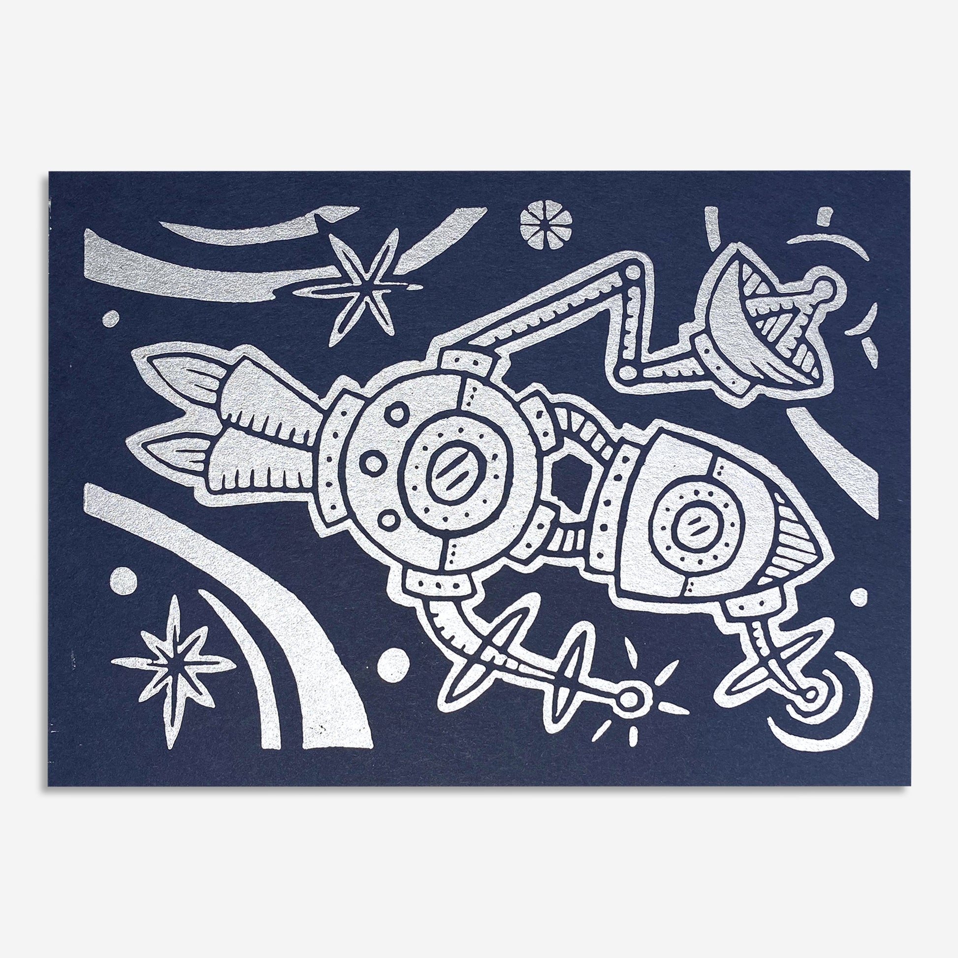 One color linocut print with metallic silver ink on midnight blue cardstock.
