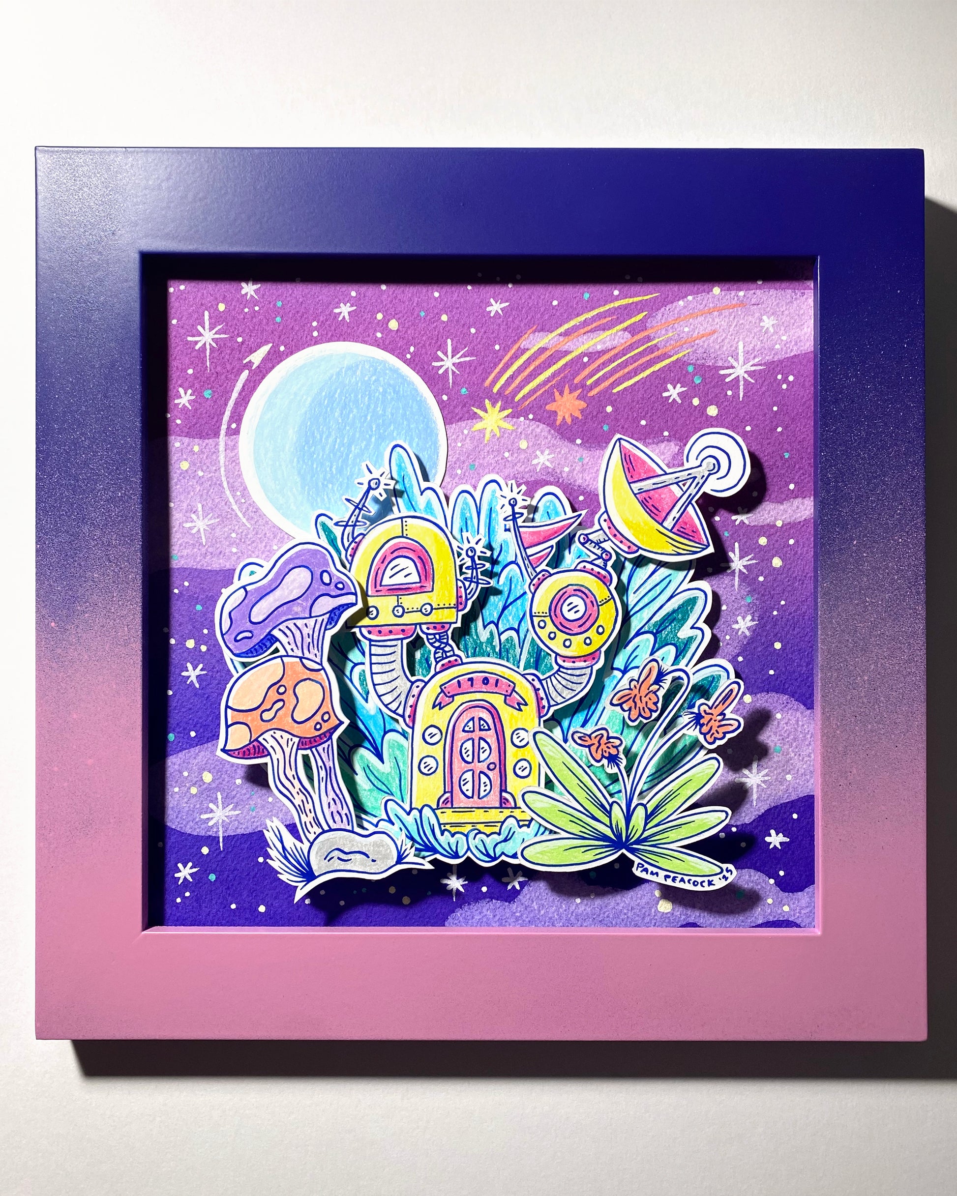 Cut paper illustration in colored pencil, watercolor, and acrylic; framed